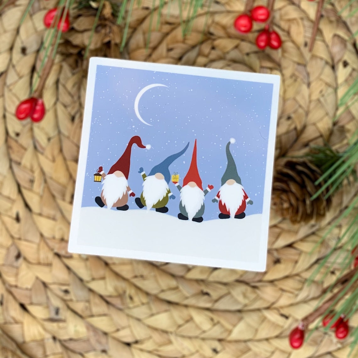 This "Christmas Gnomes" sticker is printed on beautiful, vibrant colors on vinyl sticker paper. This sticker is perfect for water-bottles, s, laptops, tablets, iPads, tumblers, journals and notebooks.