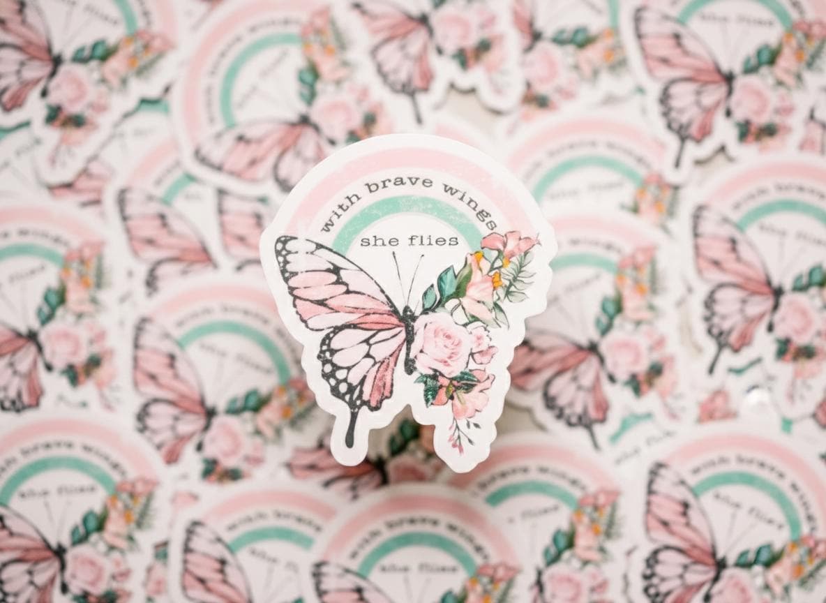Butterfly Sticker, With Brave Wings She Flies Label, Motivational Sticker, Animal Sticker, Butterfly Car Decal, Laptop Label, Vinyl Stickers