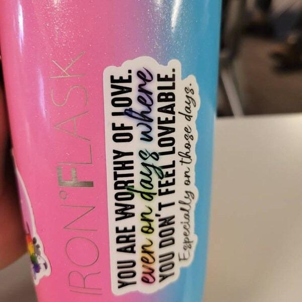 The "You Are Worthy Of Love" sticker is printed on beautiful, vibrant colors on vinyl sticker paper. This sticker is perfect for water-bottles, laptops, tablets, tumblers, journals and not