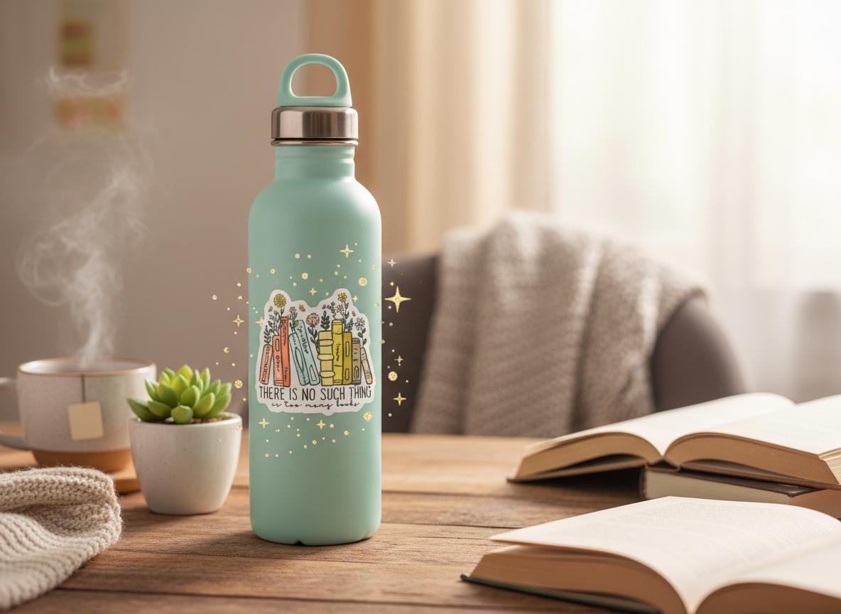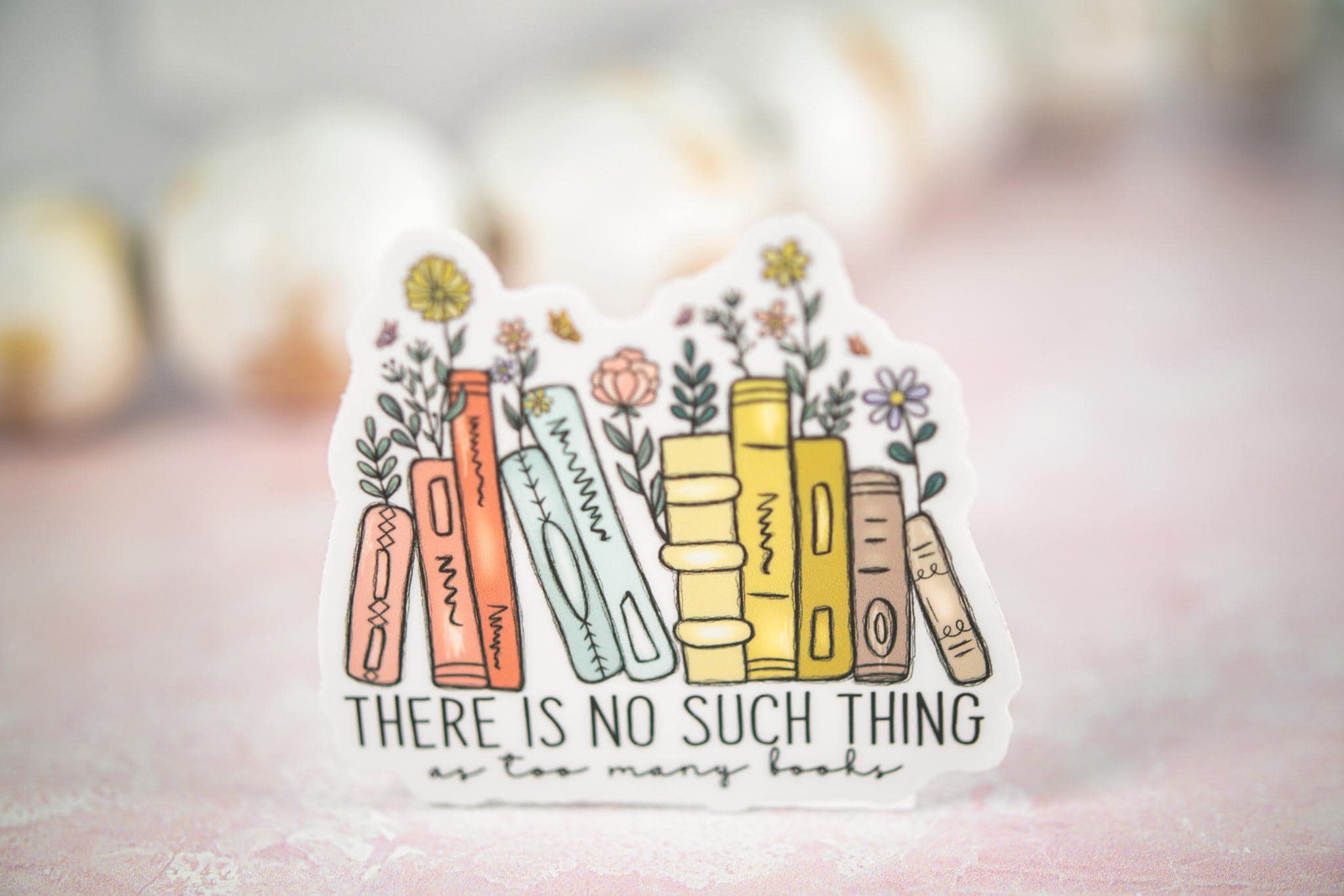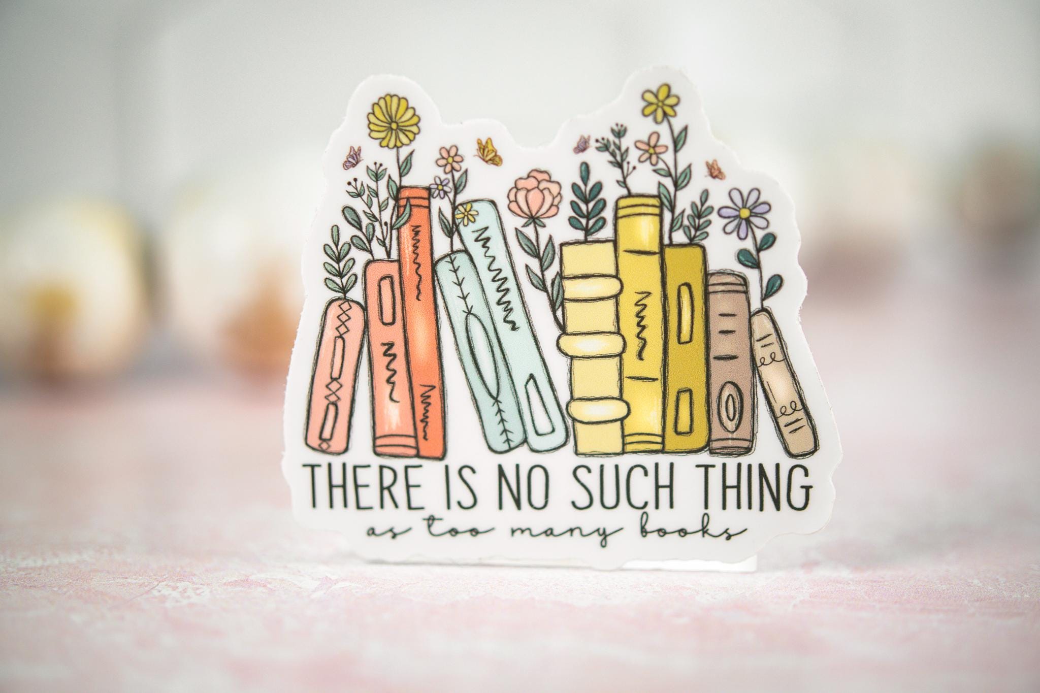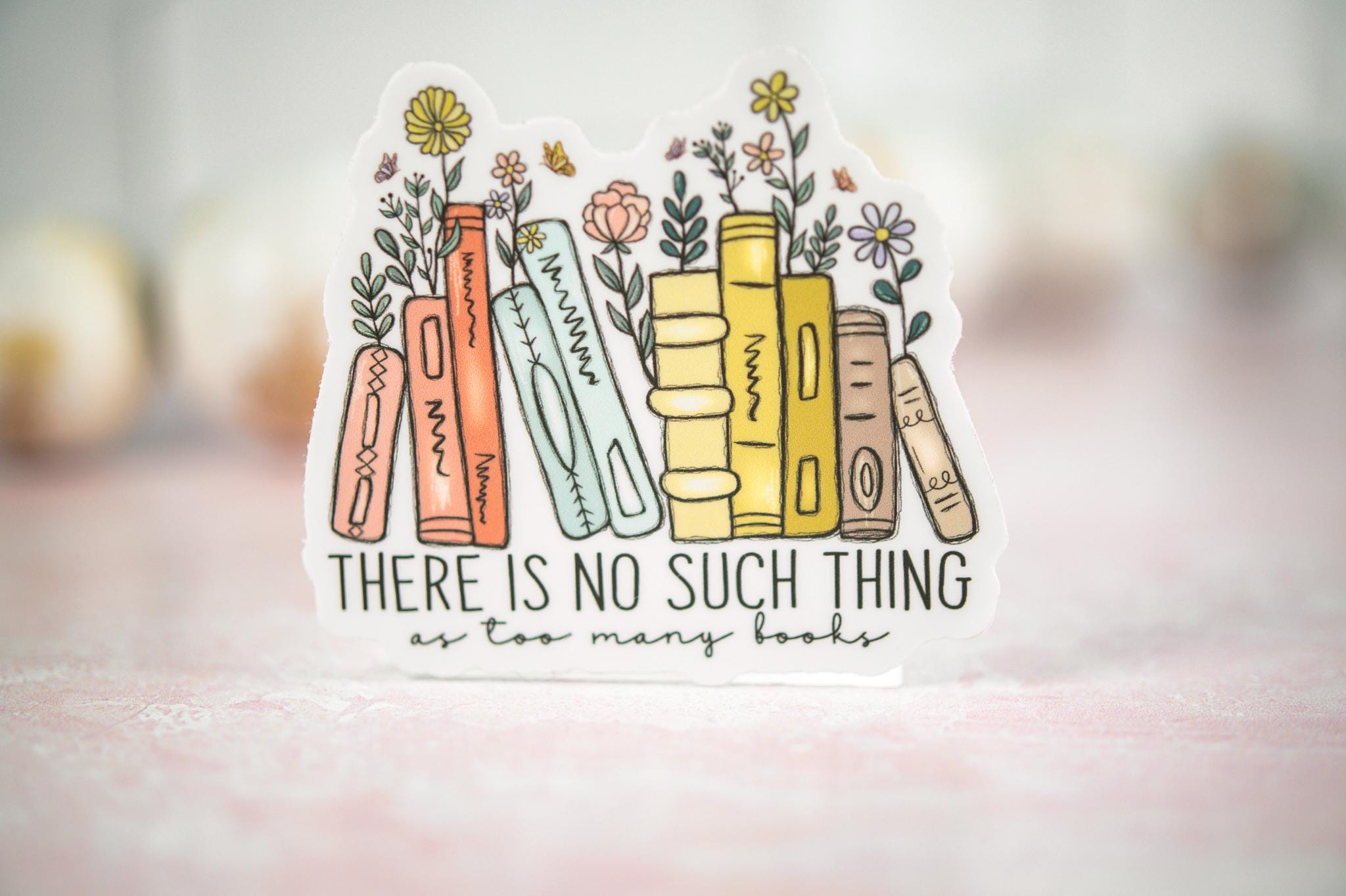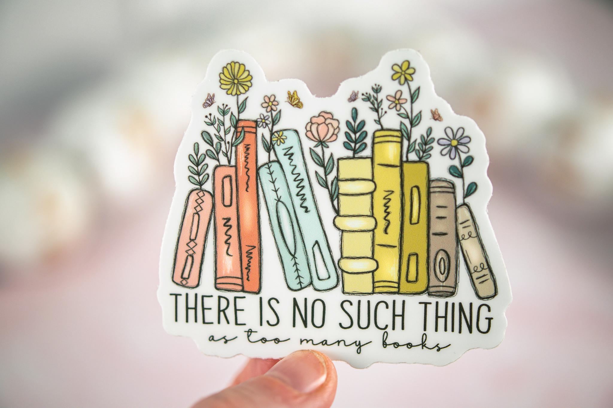The "There Is No Such Thing As Too Many Books" sticker is printed on beautiful, vibrant colors on vinyl sticker paper. This sticker is perfect for water-bottles, laptops, tablets, tumblers, journals and not