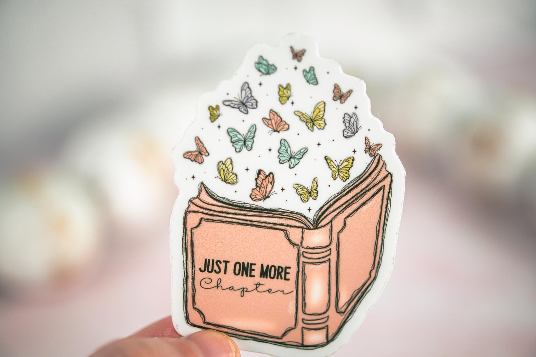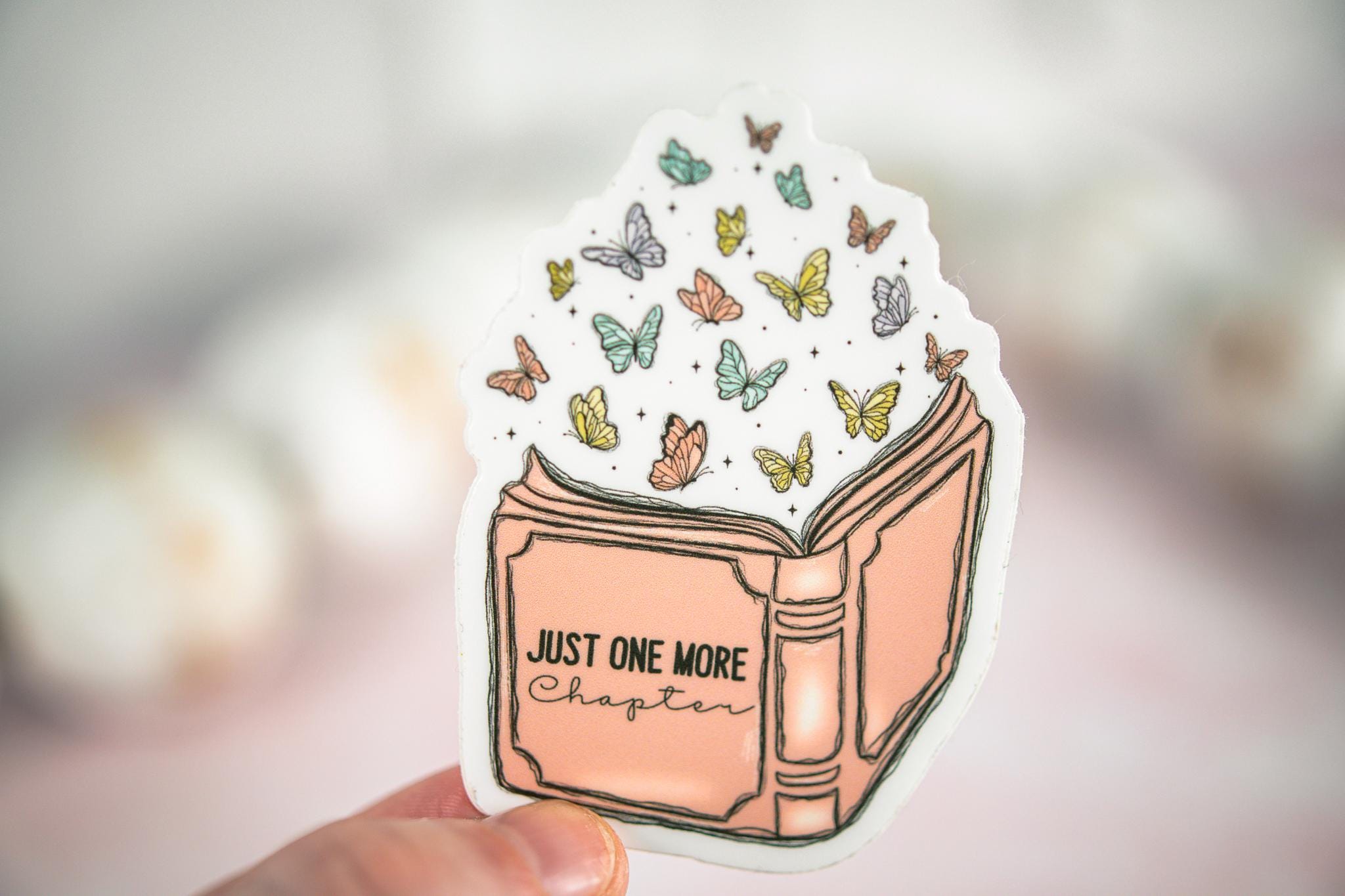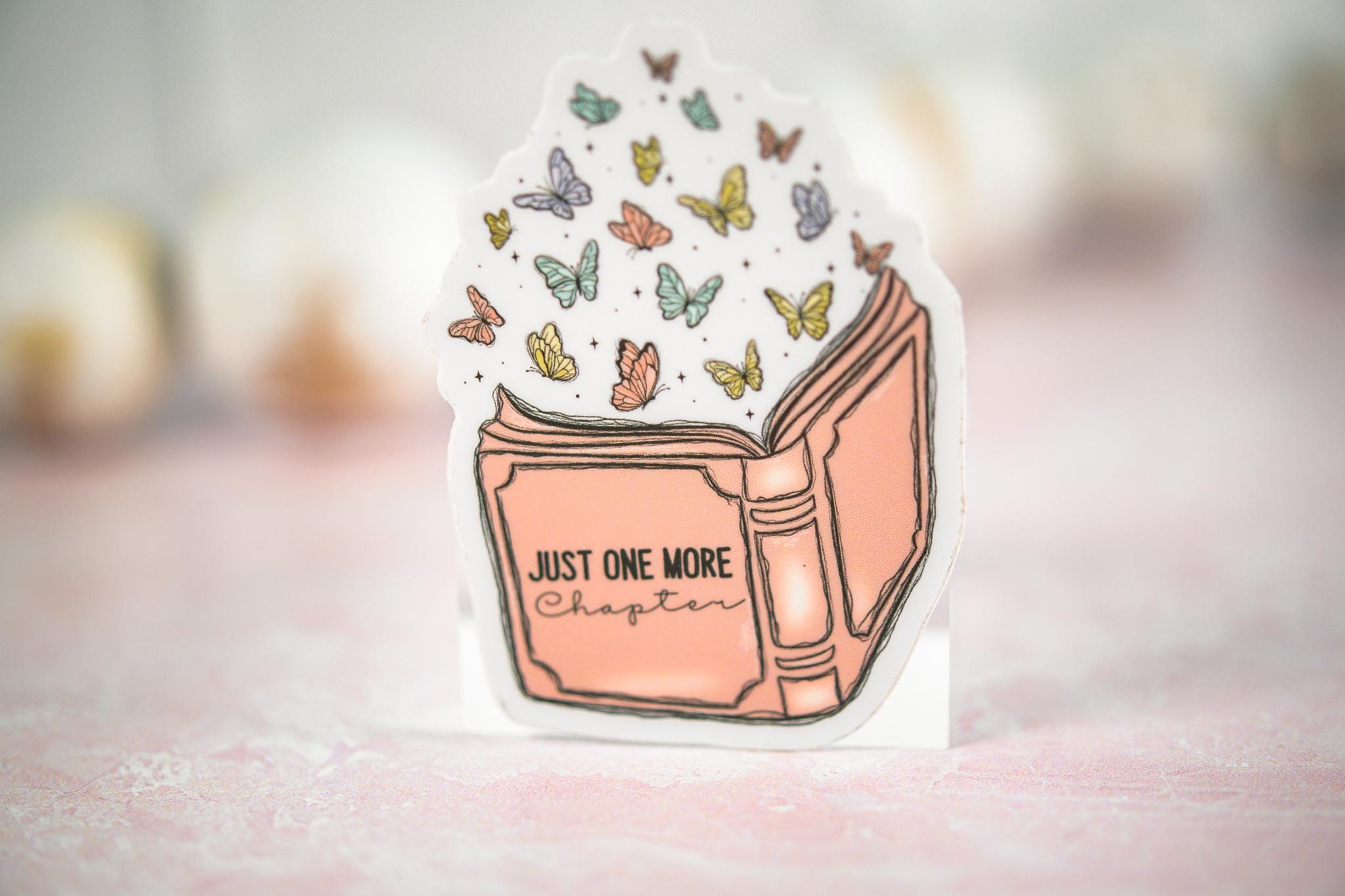 The "Just One More Chapter" sticker is printed on beautiful, vibrant colors on vinyl sticker paper. This sticker is perfect for water-bottles, laptops, tablets, tumblers, journals and not