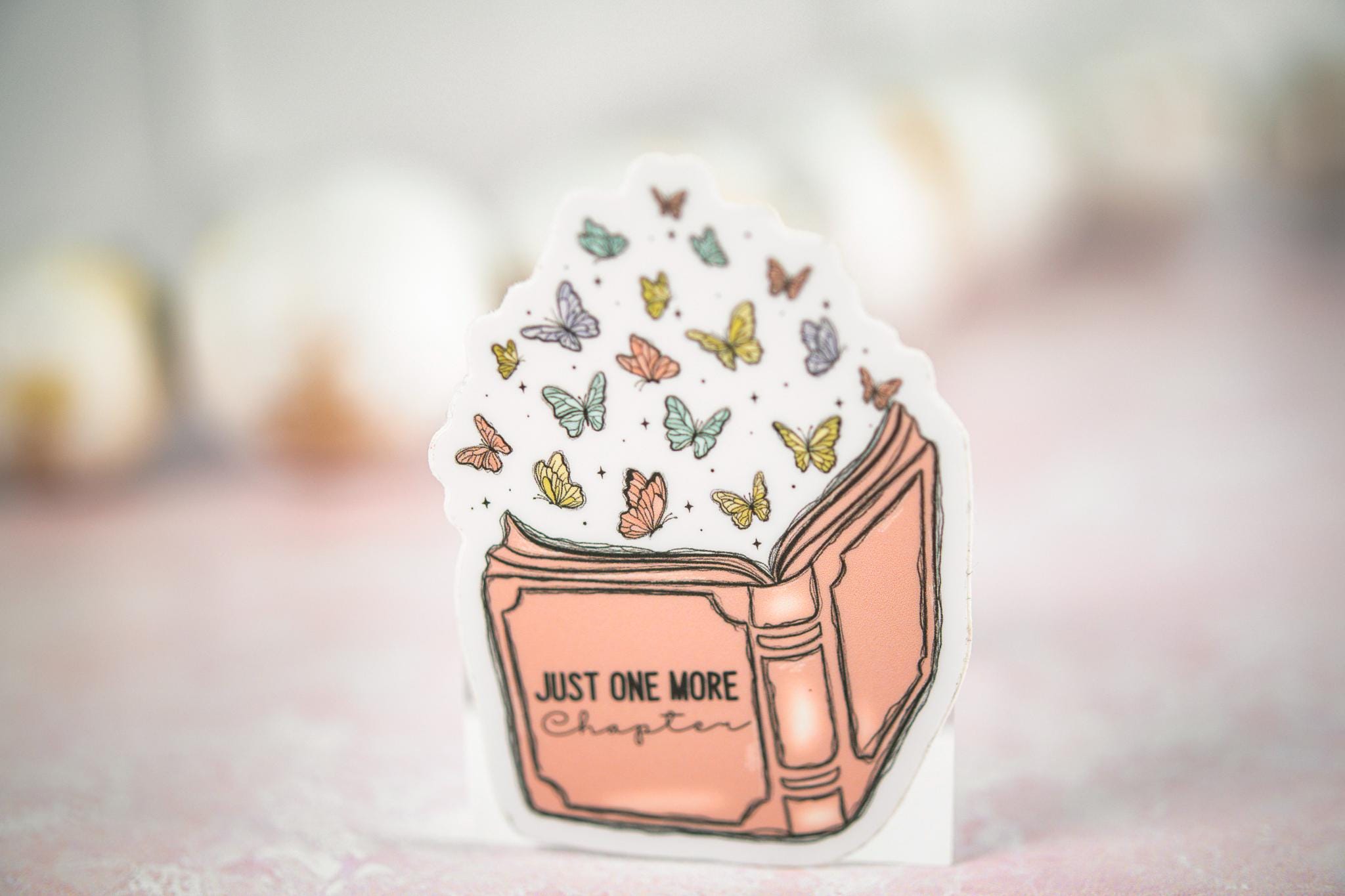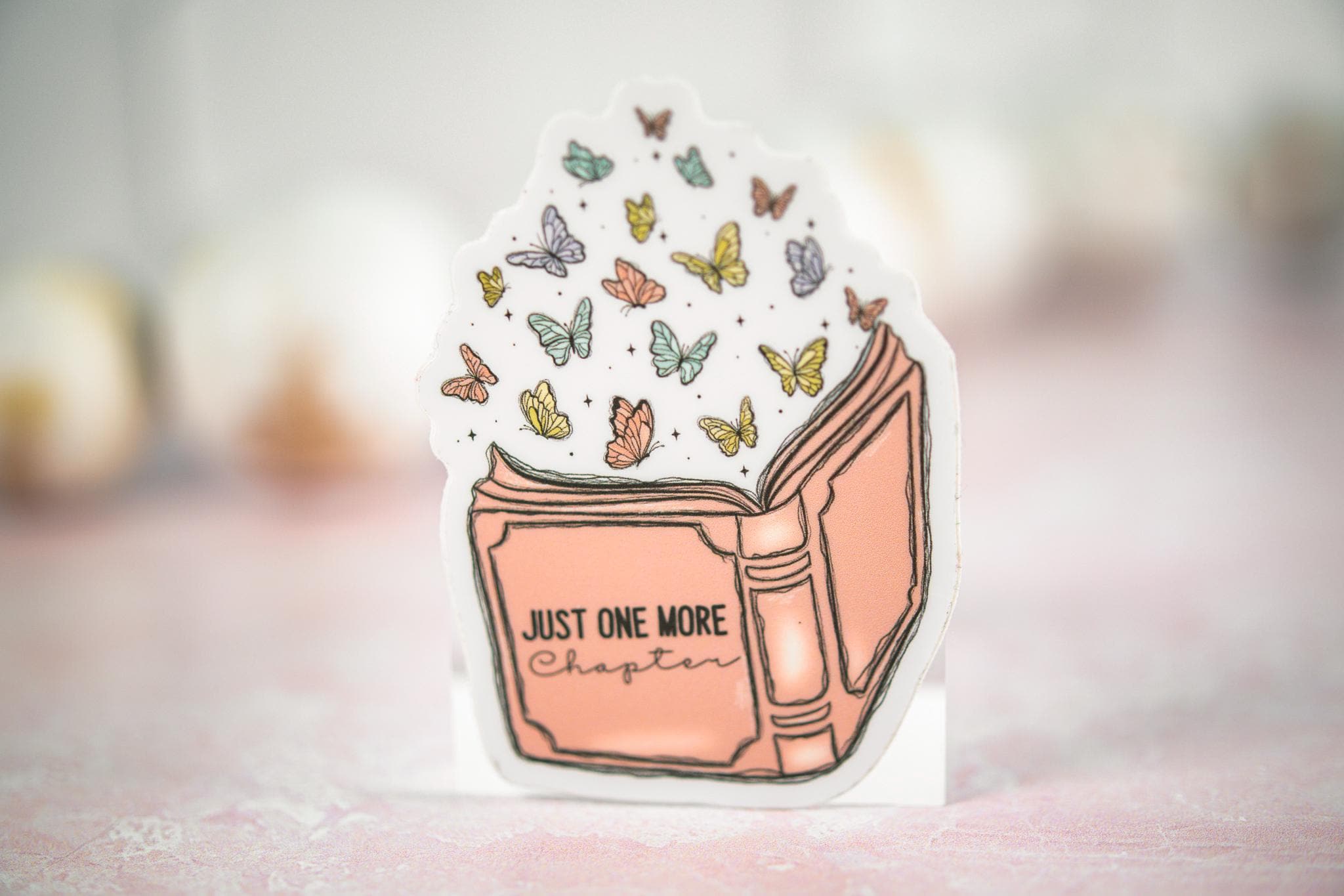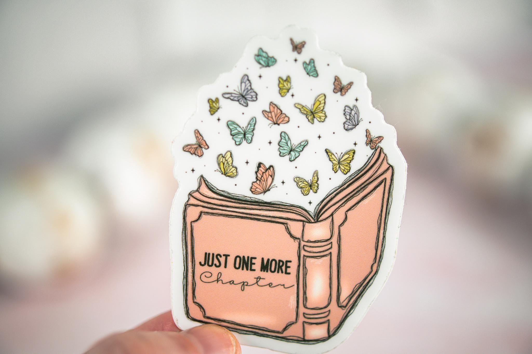The "Just One More Chapter" sticker is printed on beautiful, vibrant colors on vinyl sticker paper. This sticker is perfect for water-bottles, laptops, tablets, tumblers, journals and not