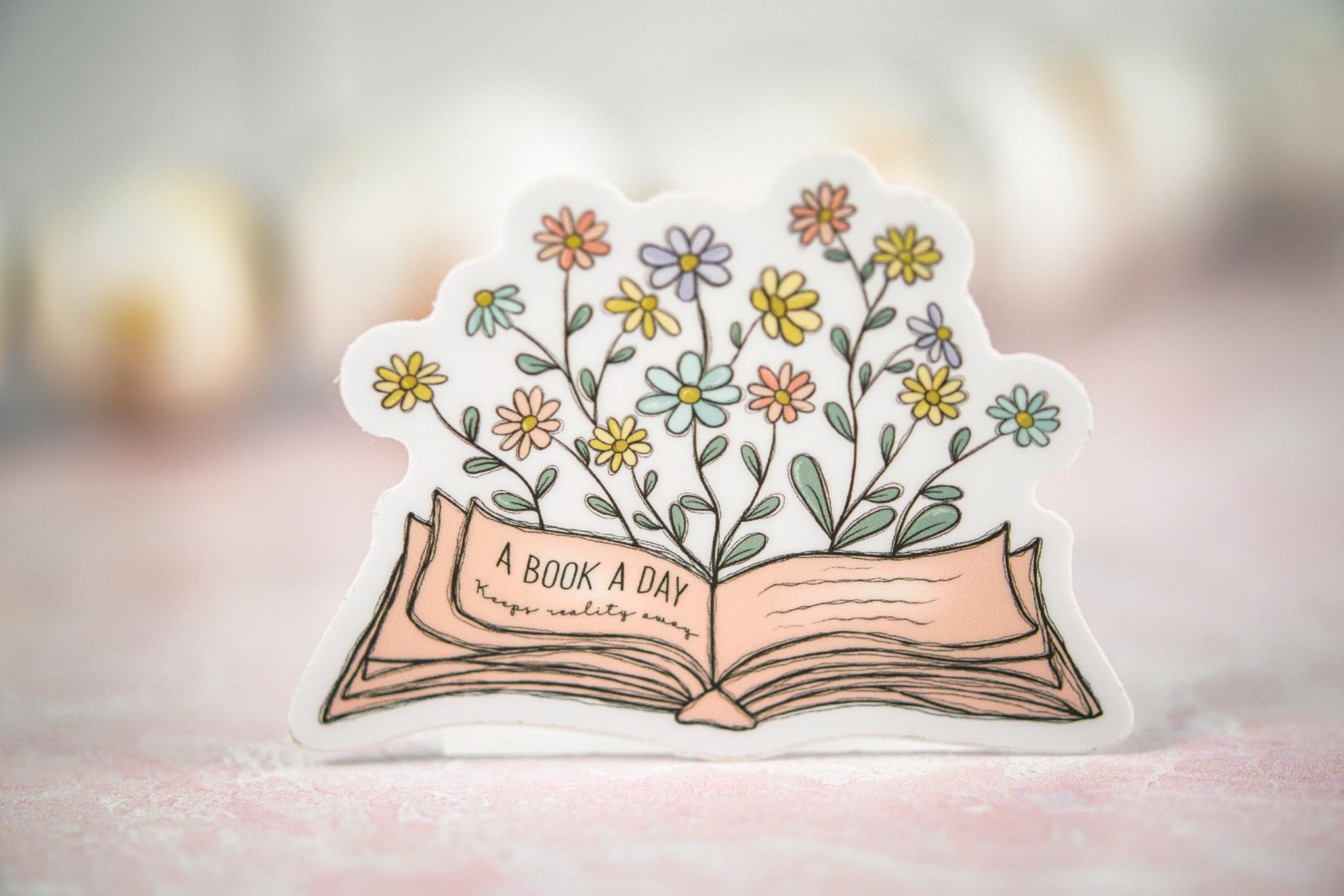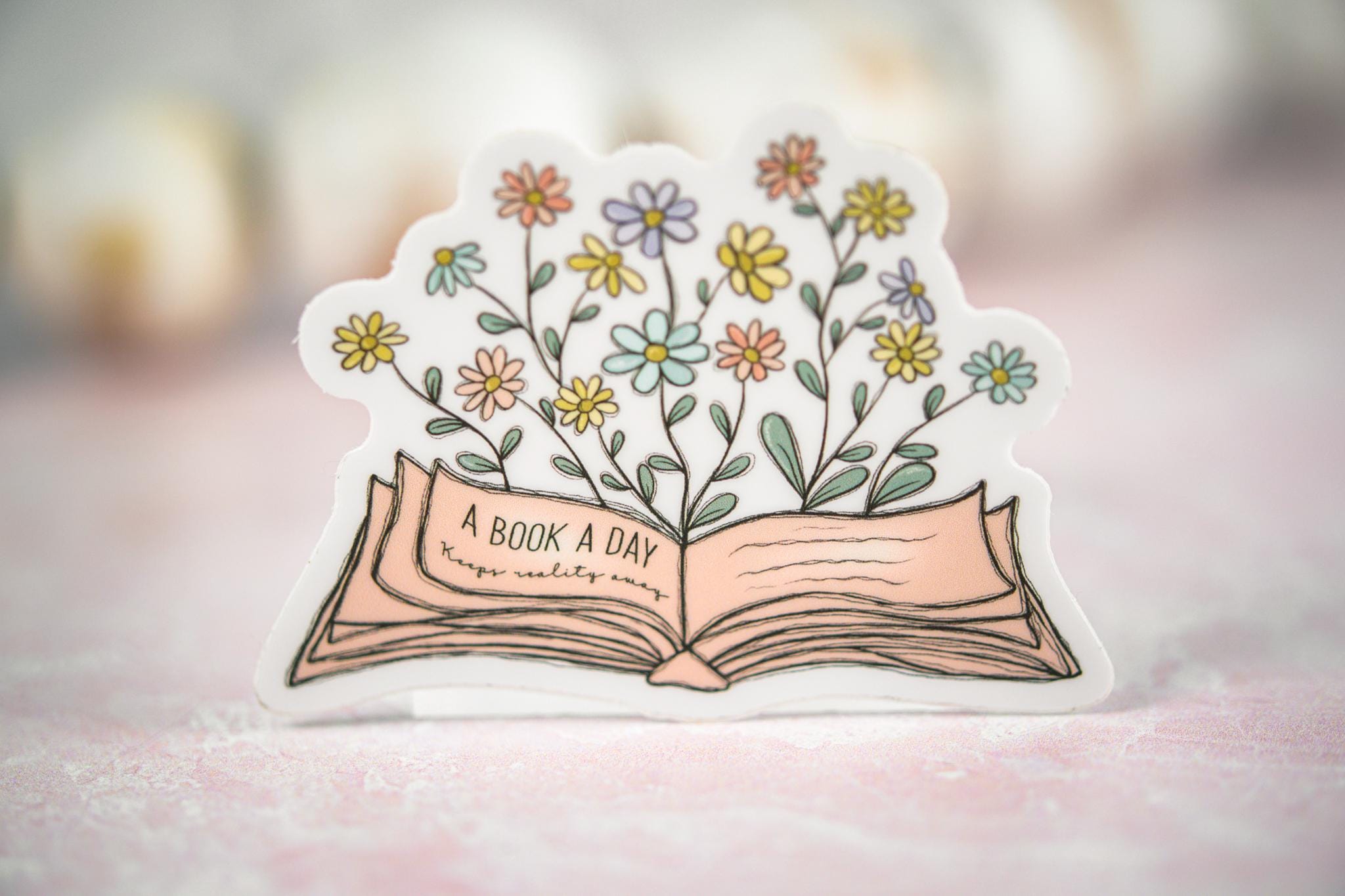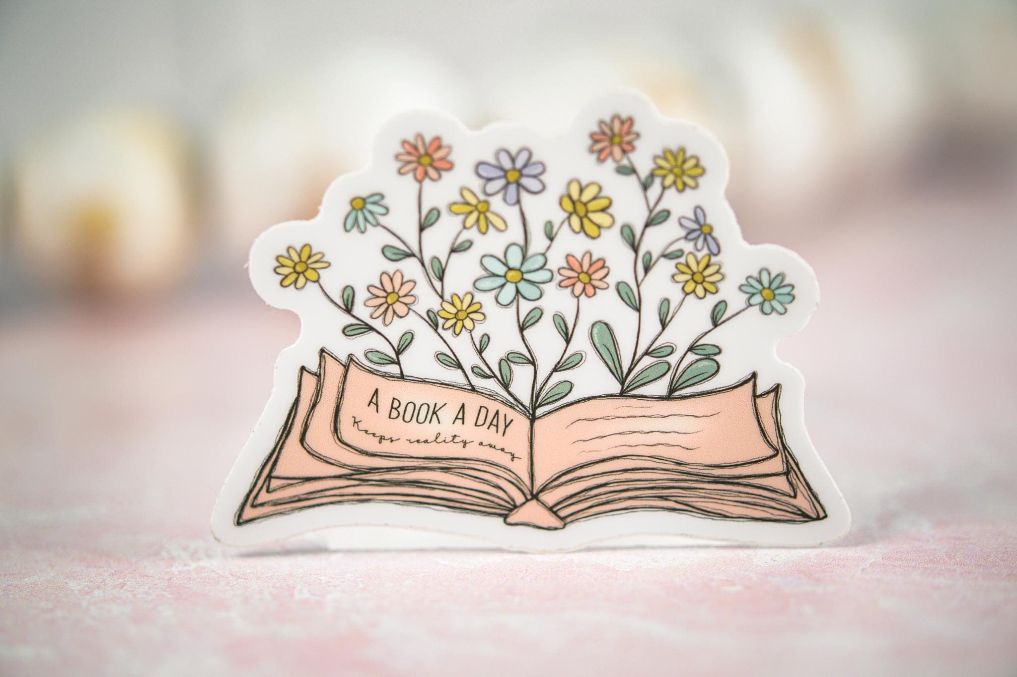 The "A Book A Day Keeps Reality Away" sticker is printed on beautiful, vibrant colors on vinyl sticker paper. This sticker is perfect for water-bottles, laptops, tablets, tumblers, journals and not